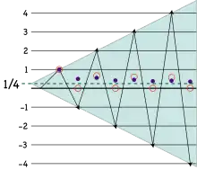 La divergence de la série peut être établie par le fait que la suite de ses termes successifs ne tend pas vers 0 (série dite grossièrement divergente, par un critère classique). Cependant, cette divergence peut être établie par un argument plus précis, en effet la suite des sommes partielles prend comme valeur chaque entier relatif exactement une fois[1] :