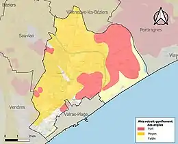 Le retrait-gonflement des sols argileux est susceptible d'engendrer des dommages importants aux bâtiments en cas d’alternance de périodes de sécheresse et de pluie. 84,8 % de la superficie communale est en aléa moyen ou fort (59,3 % au niveau départemental et 48,5 % au niveau national). Sur les 3 701 bâtiments dénombrés sur la commune en 2019, 3 059 sont en aléa moyen ou fort, soit 83 %, à comparer aux 85 % au niveau départemental et 54 % au niveau national. Une cartographie de l'exposition du territoire national au retrait gonflement des sols argileux est disponible sur le site du BRGM[38],[Carte 2].