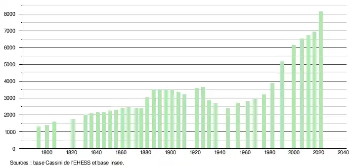 L'évolution du nombre d'habitants est connue à travers les recensements de la population effectués dans la commune depuis 1793. Pour les communes de moins de 10 000 habitants, une enquête de recensement portant sur toute la population est réalisée tous les cinq ans, les populations légales des années intermédiaires étant quant à elles estimées par interpolation ou extrapolation[48]. Pour la commune, le premier recensement exhaustif entrant dans le cadre du nouveau dispositif a été réalisé en 2006[49].