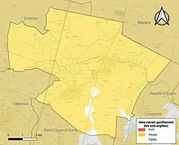 Le retrait-gonflement des sols argileux est susceptible d'engendrer des dommages importants aux bâtiments en cas d’alternance de périodes de sécheresse et de pluie. 97,6 % de la superficie communale est en aléa moyen ou fort (54,2 % au niveau départemental et 48,5 % au niveau national). Sur les 989 bâtiments dénombrés sur la commune en 2019, 989 sont en aléa moyen ou fort, soit 100 %, à comparer aux 57 % au niveau départemental et 54 % au niveau national. Une cartographie de l'exposition du territoire national au retrait gonflement des sols argileux est disponible sur le site du BRGM[16],[Carte 2].
