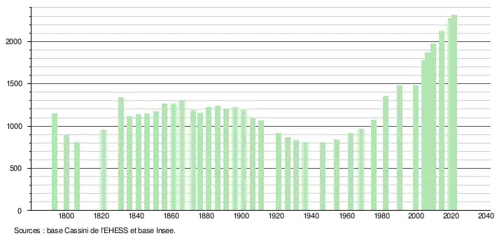 L'évolution du nombre d'habitants est connue à travers les recensements de la population effectués dans la commune depuis 1793. Pour les communes de moins de 10 000 habitants, une enquête de recensement portant sur toute la population est réalisée tous les cinq ans, les populations légales des années intermédiaires étant quant à elles estimées par interpolation ou extrapolation[21]. Pour la commune, le premier recensement exhaustif entrant dans le cadre du nouveau dispositif a été réalisé en 2004[22].