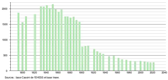 L'évolution du nombre d'habitants est connue à travers les recensements de la population effectués dans la commune depuis 1793. Pour les communes de moins de 10 000 habitants, une enquête de recensement portant sur toute la population est réalisée tous les cinq ans, les populations légales des années intermédiaires étant quant à elles estimées par interpolation ou extrapolation[26]. Pour la commune, le premier recensement exhaustif entrant dans le cadre du nouveau dispositif a été réalisé en 2006[27].