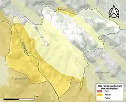 Le retrait-gonflement des sols argileux est susceptible d'engendrer des dommages importants aux bâtiments en cas d’alternance de périodes de sécheresse et de pluie. 34,3 % de la superficie communale est en aléa moyen ou fort (26,8 % au niveau départemental et 48,5 % au niveau national). Sur les 188 bâtiments dénombrés sur la commune en 2019, 72 sont en aléa moyen ou fort, soit 38 %, à comparer aux 36 % au niveau départemental et 54 % au niveau national. Une cartographie de l'exposition du territoire national au retrait gonflement des sols argileux est disponible sur le site du BRGM[16],[Carte 2].