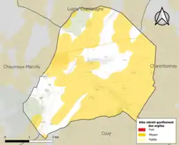 La commune est vulnérable au risque de mouvements de terrains constitué principalement du retrait-gonflement des sols argileux[15]. Cet aléa est susceptible d'engendrer des dommages importants aux bâtiments en cas d’alternance de périodes de sécheresse et de pluie. 66,5 % de la superficie communale est en aléa moyen ou fort (90 % au niveau départemental et 48,5 % au niveau national). Sur les 45 bâtiments dénombrés sur la commune en 2019, 8 sont en aléa moyen ou fort, soit 18 %, à comparer aux 83 % au niveau départemental et 54 % au niveau national. Une cartographie de l'exposition du territoire national au retrait gonflement des sols argileux est disponible sur le site du BRGM[16],[Carte 2].
