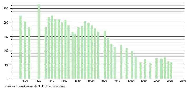 L'évolution du nombre d'habitants est connue à travers les recensements de la population effectués dans la commune depuis 1793. Pour les communes de moins de 10 000 habitants, une enquête de recensement portant sur toute la population est réalisée tous les cinq ans, les populations légales des années intermédiaires étant quant à elles estimées par interpolation ou extrapolation[20]. Pour la commune, le premier recensement exhaustif entrant dans le cadre du nouveau dispositif a été réalisé en 2007[21].