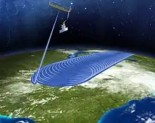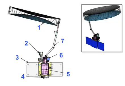 L'angle de visée de l'antenne est dépointé par rapport à l'axe nadir du satellite. La poutrelle qui maintient l'antenne est fixée sur une plateforme qui est mise en rotation à la vitesse de 14,6 tours par minute autour de l'axe. Ce mouvement imprimé à l'antenne permet à son faisceau d'effectuer un balayage conique qui permet après intégration d'obtenir une fauchée de 1000 kilomètres. Ce réflecteur est développé par la société américaine Northrop Grumman[5],[3].