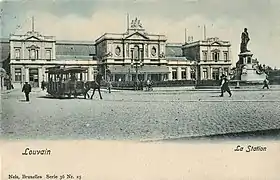 Entre 1874 et 1912, un tramway à cheval dessert la ville[2]. Une première ligne fonctionne entre la rue de la Station (Stationsstraat) et Blauwe Hoek ouverte le . Elle est prolongée vers la place du marché (Grote Markt) en 1895. La société anonyme des tramways de Louvain (TL) exploite ce réseau construit à voie normale
