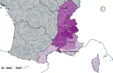 Localisation du cours de la Saône dans le bassin du Rhône. | |