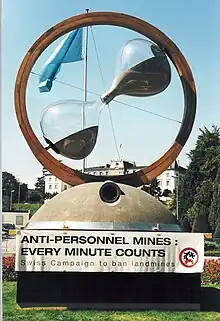 La même année, le sablier sera utilisé lors de la convention sur l’interdiction des mines antipersonnel. Il est alors placé devant le Palais des Nations. « Il symbolise alors le fait qu'un enfant a été mutilé par ces armes à chaque tour de sablier, toutes les vingt minutes. »[4]. Le sablier va ensuite trouver place au centre commercial de Balexert puis, dès 2003, il sera remisé dans un hangar des SIG.
