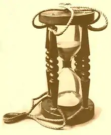 Dans les longs parcours de la navigation à travers l'océan, le sablier marin utilisé pour mesurer le temps, a été un outil aussi important que la boussole (qui indique la direction de la navigation), pouvant entre les deux estimer la position du navire[2],[3]. Le sablier, rempli avec du sable (ou encore coquille d'œuf finement pilée ou poudre de marbre noir séchée neuf fois) pour mesurer une demi-heure, le temps qu'une fiole se vide, était appelée "horloge" ou encore "horloge à sablon" ; huit sabliers (quatre heures) définissaient un "quart"[19]. Le nombre de fois ou le sablier était retourné, lié à l'enregistrement dans le journal de bord de la vitesse mesurée avec le "loch à bateau", permettait au navigateur de tracer sa position estimée sur la carte. En multipliant la vitesse du navire par le temps on obtient la distance parcourue, une simple méthode classique appelée navigation à l'estime.