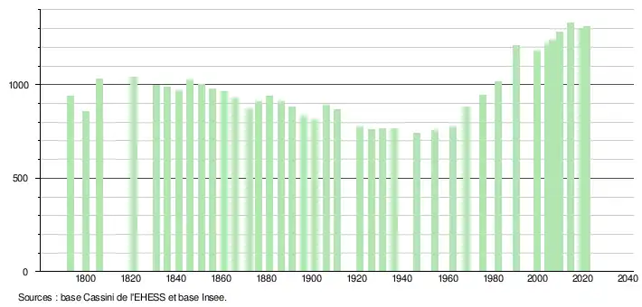L'évolution du nombre d'habitants est connue à travers les recensements de la population effectués dans la commune depuis 1793. Pour les communes de moins de 10 000 habitants, une enquête de recensement portant sur toute la population est réalisée tous les cinq ans, les populations légales des années intermédiaires étant quant à elles estimées par interpolation ou extrapolation[23]. Pour la commune, le premier recensement exhaustif entrant dans le cadre du nouveau dispositif a été réalisé en 2004[24].