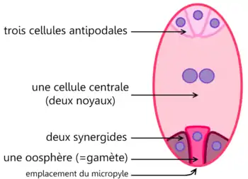 Le sac embryonnaire est en général composé de sept noyaux individualisés en cellules ou non : trois antipodes, deux synergides, une oosphère (qui donnera l'embryon à la suite de la fécondation) et une cellule centrale (deux noyaux polaires au sein d'un même cytoplasme). Chez certains groupes de plantes, le nombre de noyaux et de cellules du sac est différent[1]. Les Onagracées par exemple possèdent un sac embryonnaire à quatre cellules : une oosphère, deux synergides, et un noyau central. Chez les Graminées, les antipodes subissent des divisions supplémentaires, de sorte que le sac embryonnaire contient plus de 8 noyaux.