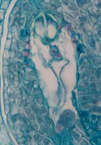 Après la double fécondation, le sac embryonnaire donne naissance d'une part à l'embryon et d'autre part à l'albumen, tissu de réserve qui servira à nourrir la jeune plantule avant qu'elle ne devienne autotrophe.