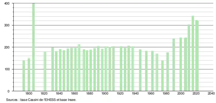 L'évolution du nombre d'habitants est connue à travers les recensements de la population effectués dans la commune depuis 1793. Pour les communes de moins de 10 000 habitants, une enquête de recensement portant sur toute la population est réalisée tous les cinq ans, les populations légales des années intermédiaires étant quant à elles estimées par interpolation ou extrapolation[30]. Pour la commune, le premier recensement exhaustif entrant dans le cadre du nouveau dispositif a été réalisé en 2005[31].