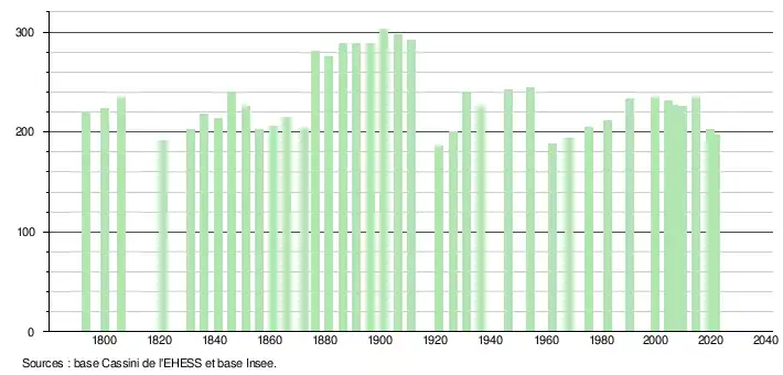 L'évolution du nombre d'habitants est connue à travers les recensements de la population effectués dans la commune depuis 1793. Pour les communes de moins de 10 000 habitants, une enquête de recensement portant sur toute la population est réalisée tous les cinq ans, les populations légales des années intermédiaires étant quant à elles estimées par interpolation ou extrapolation[21]. Pour la commune, le premier recensement exhaustif entrant dans le cadre du nouveau dispositif a été réalisé en 2004[22].