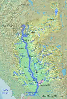 Parmi ses affluents se trouvent les rivières Feather (rg[note 1]), Pit (rg), McCloud (rg) et American (rg), Cottonwood Creek (rd).
