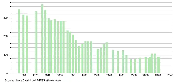 L'évolution du nombre d'habitants est connue à travers les recensements de la population effectués dans la commune depuis 1793. Pour les communes de moins de 10 000 habitants, une enquête de recensement portant sur toute la population est réalisée tous les cinq ans, les populations légales des années intermédiaires étant quant à elles estimées par interpolation ou extrapolation[15]. Pour la commune, le premier recensement exhaustif entrant dans le cadre du nouveau dispositif a été réalisé en 2004[16].