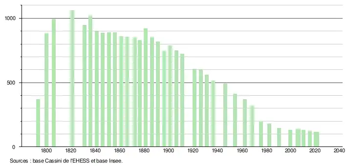 L'évolution du nombre d'habitants est connue à travers les recensements de la population effectués dans la commune depuis 1793. Pour les communes de moins de 10 000 habitants, une enquête de recensement portant sur toute la population est réalisée tous les cinq ans, les populations légales des années intermédiaires étant quant à elles estimées par interpolation ou extrapolation[22]. Pour la commune, le premier recensement exhaustif entrant dans le cadre du nouveau dispositif a été réalisé en 2005[23].
