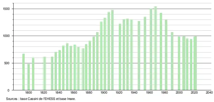 L'évolution du nombre d'habitants est connue à travers les recensements de la population effectués dans la commune depuis 1793. Pour les communes de moins de 10 000 habitants, une enquête de recensement portant sur toute la population est réalisée tous les cinq ans, les populations légales des années intermédiaires étant quant à elles estimées par interpolation ou extrapolation[18]. Pour la commune, le premier recensement exhaustif entrant dans le cadre du nouveau dispositif a été réalisé en 2005[19].