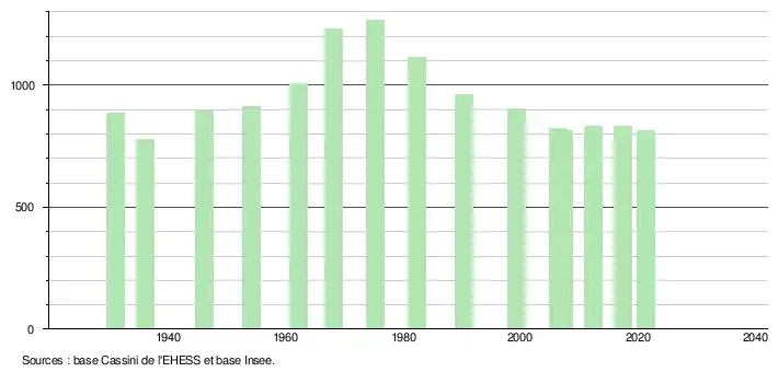 L'évolution du nombre d'habitants est connue à travers les recensements de la population effectués dans la commune depuis 1931. Pour les communes de moins de 10 000 habitants, une enquête de recensement portant sur toute la population est réalisée tous les cinq ans, les populations légales des années intermédiaires étant quant à elles estimées par interpolation ou extrapolation[26]. Pour la commune, le premier recensement exhaustif entrant dans le cadre du nouveau dispositif a été réalisé en 2007[27].