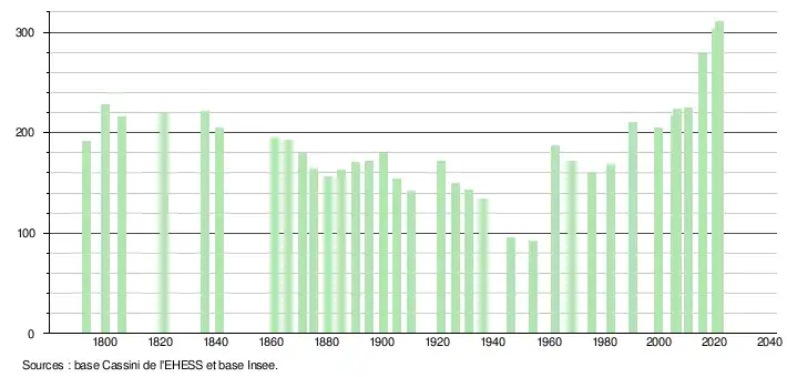 L'évolution du nombre d'habitants est connue à travers les recensements de la population effectués dans la commune depuis 1793. Pour les communes de moins de 10 000 habitants, une enquête de recensement portant sur toute la population est réalisée tous les cinq ans, les populations légales des années intermédiaires étant quant à elles estimées par interpolation ou extrapolation[20]. Pour la commune, le premier recensement exhaustif entrant dans le cadre du nouveau dispositif a été réalisé en 2005[21].