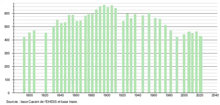 L'évolution du nombre d'habitants est connue à travers les recensements de la population effectués dans la commune depuis 1793. Pour les communes de moins de 10 000 habitants, une enquête de recensement portant sur toute la population est réalisée tous les cinq ans, les populations légales des années intermédiaires étant quant à elles estimées par interpolation ou extrapolation[23]. Pour la commune, le premier recensement exhaustif entrant dans le cadre du nouveau dispositif a été réalisé en 2005[24].