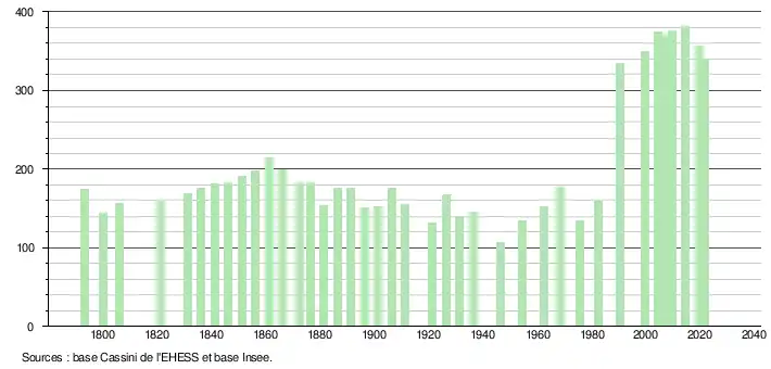 L'évolution du nombre d'habitants est connue à travers les recensements de la population effectués dans la commune depuis 1793. Pour les communes de moins de 10 000 habitants, une enquête de recensement portant sur toute la population est réalisée tous les cinq ans, les populations légales des années intermédiaires étant quant à elles estimées par interpolation ou extrapolation[20]. Pour la commune, le premier recensement exhaustif entrant dans le cadre du nouveau dispositif a été réalisé en 2004[21].