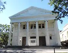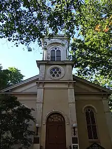 Lors de la construction, l'entrée principale se faisait par un arc central en plein cintre sur le devant, qui était surmonté d'un fronton entouré de pilastres doriques. Une fenêtre en plein cintre et un linteau flanquaient de chaque côté l'entrée principale, tandis qu'un pilastre était situé à chaque coin[35]. En 1873, un observateur a déclaré que la chapelle était un « bâtiment en brique simple mais beau, sans coupole ni beffroi »[37]. Les murs sont repeints cette année-là, avec des éléments décoratifs ressemblant à des panneaux et des pilastres. Le beffroi et les vitraux datent de 1883. La chapelle a été déplacée à 200 pieds ( Unité « » inconnue du modèle {{Conversion}}.) de son emplacement précédent en 1893[35]. Veteran's Memorial Hall a été endommagé en 2014[38] et le bâtiment est fermé au public depuis 2018[29].