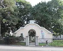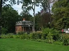 La clôture sur le bord nord de la propriété, construite au milieu du XIXe siècle dans le style Greek Revival, est désignée comme un point de repère de la ville. Plusieurs portes flanquées de poteaux de granit y étaient encastrées[39].