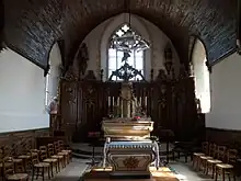 - Presbytère en schiste XVIIIe siècle, avec plafond gothique flamboyant (XVe siècle) provenant de la Motte, classé au titre objet aux monuments historiques[20].