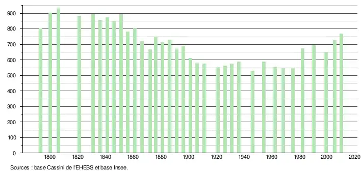 L'évolution du nombre d'habitants est connue à travers les recensements de la population effectués dans la commune depuis 1793. À partir du , les populations légales des communes sont publiées annuellement dans le cadre d'un recensement qui repose désormais sur une collecte d'information annuelle, concernant successivement tous les territoires communaux au cours d'une période de cinq ans. Pour les communes de moins de 10 000 habitants, une enquête de recensement portant sur toute la population est réalisée tous les cinq ans, les populations légales des années intermédiaires étant quant à elles estimées par interpolation ou extrapolation[14]. Pour la commune, le premier recensement exhaustif entrant dans le cadre du nouveau dispositif a été réalisé en 2005[15],[Note 2].