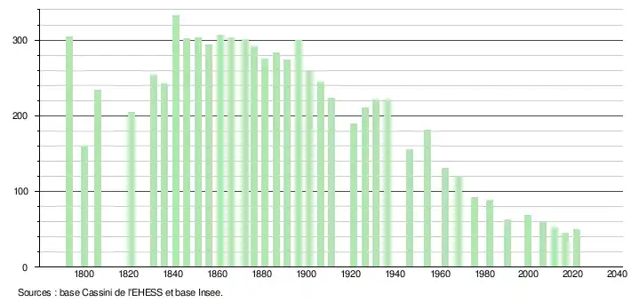 L'évolution du nombre d'habitants est connue à travers les recensements de la population effectués dans la commune depuis 1793. Pour les communes de moins de 10 000 habitants, une enquête de recensement portant sur toute la population est réalisée tous les cinq ans, les populations légales des années intermédiaires étant quant à elles estimées par interpolation ou extrapolation[16]. Pour la commune, le premier recensement exhaustif entrant dans le cadre du nouveau dispositif a été réalisé en 2006[17].