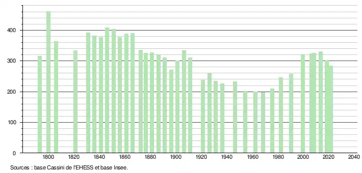 L'évolution du nombre d'habitants est connue à travers les recensements de la population effectués dans la commune depuis 1793. Pour les communes de moins de 10 000 habitants, une enquête de recensement portant sur toute la population est réalisée tous les cinq ans, les populations légales des années intermédiaires étant quant à elles estimées par interpolation ou extrapolation[18]. Pour la commune, le premier recensement exhaustif entrant dans le cadre du nouveau dispositif a été réalisé en 2008[19].
