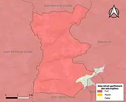 Les mouvements de terrains susceptibles de se produire sur la commune sont des tassements différentiels[38]. Le retrait-gonflement des sols argileux est susceptible d'engendrer des dommages importants aux bâtiments en cas d’alternance de périodes de sécheresse et de pluie[39]. 97,3 % de la superficie communale est en aléa moyen ou fort (58,6 % au niveau départemental et 48,5 % au niveau national métropolitain)[Carte 4]. Depuis le , en application de la loi ÉLAN, différentes contraintes s'imposent aux vendeurs, maîtres d'ouvrages ou constructeurs de biens situés dans une zone classée en aléa moyen ou fort[Note 4],[40].