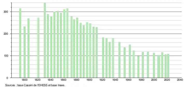 L'évolution du nombre d'habitants est connue à travers les recensements de la population effectués dans la commune depuis 1793. Pour les communes de moins de 10 000 habitants, une enquête de recensement portant sur toute la population est réalisée tous les cinq ans, les populations légales des années intermédiaires étant quant à elles estimées par interpolation ou extrapolation[51]. Pour la commune, le premier recensement exhaustif entrant dans le cadre du nouveau dispositif a été réalisé en 2007[52].