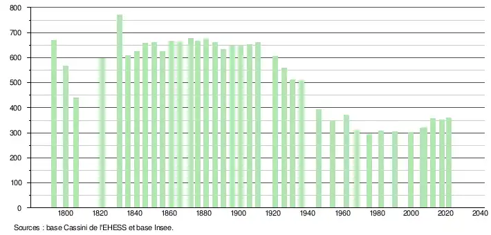 L'évolution du nombre d'habitants est connue à travers les recensements de la population effectués dans la commune depuis 1793. Pour les communes de moins de 10 000 habitants, une enquête de recensement portant sur toute la population est réalisée tous les cinq ans, les populations légales des années intermédiaires étant quant à elles estimées par interpolation ou extrapolation[21]. Pour la commune, le premier recensement exhaustif entrant dans le cadre du nouveau dispositif a été réalisé en 2007[22].