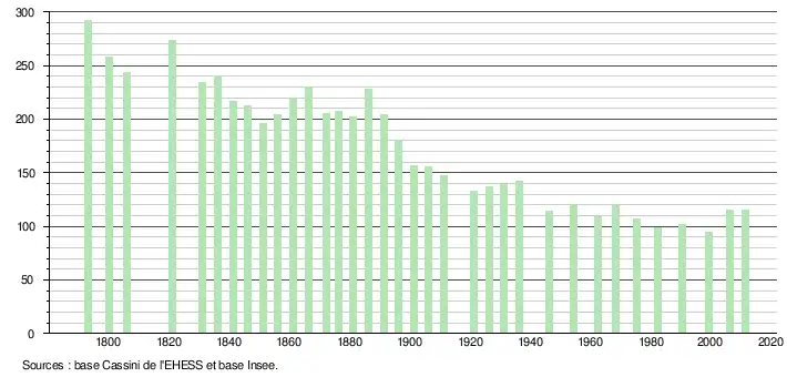 - Dans le tableau des recensements et le graphique, par convention dans Wikipédia, le principe a été retenu, pour les populations légales postérieures à 1999 de n’afficher dans le tableau des recensements et le graphique que les populations correspondant à l'année 2006, première population légale publiée calculée conformément aux concepts définis dans le décret no 2003-485 du 5 juin 2003, et les années correspondant à une enquête exhaustive de recensement pour les communes de moins de 10 000 habitants, ainsi que la dernière population légale publiée par l’Insee.