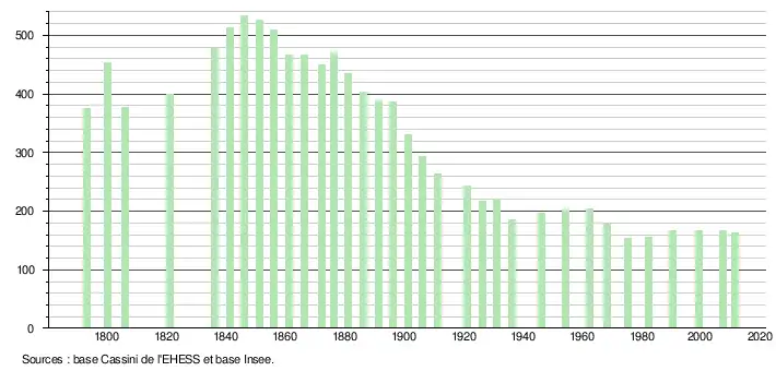 - Dans le tableau des recensements et le graphique, par convention dans Wikipédia, le principe a été retenu, pour les populations légales postérieures à 1999 de n’afficher dans le tableau des recensements et le graphique que les populations correspondant à l'année 2006, première population légale publiée calculée conformément aux concepts définis dans le décret no 2003-485 du 5 juin 2003, et les années correspondant à une enquête exhaustive de recensement pour les communes de moins de 10 000 habitants, ainsi que la dernière population légale publiée par l’Insee.