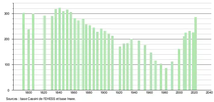 L'évolution du nombre d'habitants est connue à travers les recensements de la population effectués dans la commune depuis 1793. Pour les communes de moins de 10 000 habitants, une enquête de recensement portant sur toute la population est réalisée tous les cinq ans, les populations légales des années intermédiaires étant quant à elles estimées par interpolation ou extrapolation[28]. Pour la commune, le premier recensement exhaustif entrant dans le cadre du nouveau dispositif a été réalisé en 2008[29].