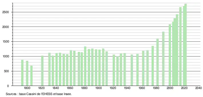 L'évolution du nombre d'habitants est connue à travers les recensements de la population effectués dans la commune depuis 1793. Pour les communes de moins de 10 000 habitants, une enquête de recensement portant sur toute la population est réalisée tous les cinq ans, les populations légales des années intermédiaires étant quant à elles estimées par interpolation ou extrapolation[23]. Pour la commune, le premier recensement exhaustif entrant dans le cadre du nouveau dispositif a été réalisé en 2004[24].