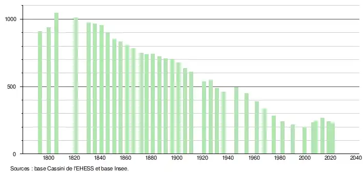 L'évolution du nombre d'habitants est connue à travers les recensements de la population effectués dans la commune depuis 1793. Pour les communes de moins de 10 000 habitants, une enquête de recensement portant sur toute la population est réalisée tous les cinq ans, les populations légales des années intermédiaires étant quant à elles estimées par interpolation ou extrapolation[24]. Pour la commune, le premier recensement exhaustif entrant dans le cadre du nouveau dispositif a été réalisé en 2008[25].