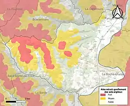 Le retrait-gonflement des sols argileux est susceptible d'engendrer des dommages importants aux bâtiments en cas d’alternance de périodes de sécheresse et de pluie. 37,7 % de la superficie communale est en aléa moyen ou fort (54,2 % au niveau départemental et 48,5 % au niveau national). Sur les 1 160 bâtiments dénombrés sur la commune en 2019, 126 sont en aléa moyen ou fort, soit 11 %, à comparer aux 57 % au niveau départemental et 54 % au niveau national. Une cartographie de l'exposition du territoire national au retrait gonflement des sols argileux est disponible sur le site du BRGM[20],[Carte 2].