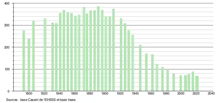 L'évolution du nombre d'habitants est connue à travers les recensements de la population effectués dans la commune depuis 1793. Pour les communes de moins de 10 000 habitants, une enquête de recensement portant sur toute la population est réalisée tous les cinq ans, les populations légales des années intermédiaires étant quant à elles estimées par interpolation ou extrapolation[18]. Pour la commune, le premier recensement exhaustif entrant dans le cadre du nouveau dispositif a été réalisé en 2005[19].