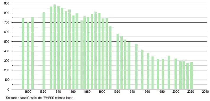 L'évolution du nombre d'habitants est connue à travers les recensements de la population effectués dans la commune depuis 1793. Pour les communes de moins de 10 000 habitants, une enquête de recensement portant sur toute la population est réalisée tous les cinq ans, les populations légales des années intermédiaires étant quant à elles estimées par interpolation ou extrapolation[21]. Pour la commune, le premier recensement exhaustif entrant dans le cadre du nouveau dispositif a été réalisé en 2005[22].