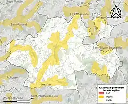 Le retrait-gonflement des sols argileux est susceptible d'engendrer des dommages importants aux bâtiments en cas d’alternance de périodes de sécheresse et de pluie. 26,8 % de la superficie communale est en aléa moyen ou fort (33,6 % au niveau départemental et 48,5 % au niveau national). Sur les 206 bâtiments dénombrés sur la commune en 2019, 36 sont en aléa moyen ou fort, soit 17 %, à comparer aux 25 % au niveau départemental et 54 % au niveau national. Une cartographie de l'exposition du territoire national au retrait gonflement des sols argileux est disponible sur le site du BRGM[18],[Carte 2].