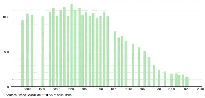 L'évolution du nombre d'habitants est connue à travers les recensements de la population effectués dans la commune depuis 1793. Pour les communes de moins de 10 000 habitants, une enquête de recensement portant sur toute la population est réalisée tous les cinq ans, les populations légales des années intermédiaires étant quant à elles estimées par interpolation ou extrapolation[18]. Pour la commune, le premier recensement exhaustif entrant dans le cadre du nouveau dispositif a été réalisé en 2005[19].