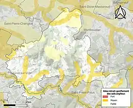 Le retrait-gonflement des sols argileux est susceptible d'engendrer des dommages importants aux bâtiments en cas d'alternance de périodes de sécheresse et de pluie. 20,2 % de la superficie communale est en aléa moyen ou fort (33,6 % au niveau départemental et 48,5 % au niveau national). Sur les 164 bâtiments dénombrés sur la commune en 2019, 5 sont en aléa moyen ou fort, soit 3 %, à comparer aux 25 % au niveau départemental et 54 % au niveau national. Une cartographie de l'exposition du territoire national au retrait gonflement des sols argileux est disponible sur le site du BRGM[17],[Carte 2].