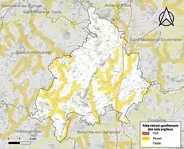 Le retrait-gonflement des sols argileux est susceptible d'engendrer des dommages importants aux bâtiments en cas d’alternance de périodes de sécheresse et de pluie[17]. 24,2 % de la superficie communale est en aléa moyen ou fort (27 % au niveau départemental et 48,5 % au niveau national métropolitain)[Carte 2]. Depuis le , en application de la loi ÉLAN, différentes contraintes s'imposent aux vendeurs, maîtres d'ouvrages ou constructeurs de biens situés dans une zone classée en aléa moyen ou fort[Note 2],[18].