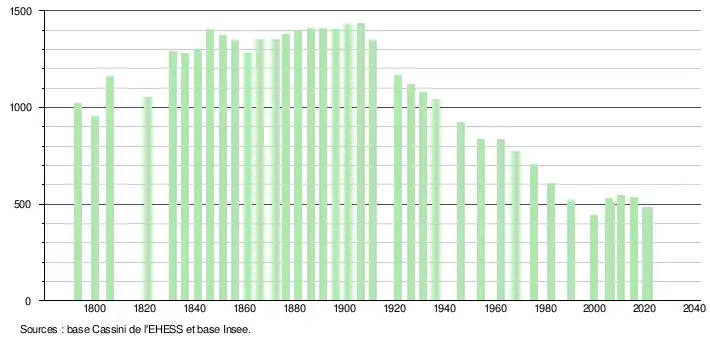 L'évolution du nombre d'habitants est connue à travers les recensements de la population effectués dans la commune depuis 1793. Pour les communes de moins de 10 000 habitants, une enquête de recensement portant sur toute la population est réalisée tous les cinq ans, les populations légales des années intermédiaires étant quant à elles estimées par interpolation ou extrapolation[24]. Pour la commune, le premier recensement exhaustif entrant dans le cadre du nouveau dispositif a été réalisé en 2005[25].