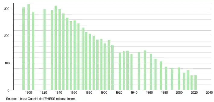 L'évolution du nombre d'habitants est connue à travers les recensements de la population effectués dans la commune depuis 1793. Pour les communes de moins de 10 000 habitants, une enquête de recensement portant sur toute la population est réalisée tous les cinq ans, les populations légales des années intermédiaires étant quant à elles estimées par interpolation ou extrapolation[16]. Pour la commune, le premier recensement exhaustif entrant dans le cadre du nouveau dispositif a été réalisé en 2006[17].